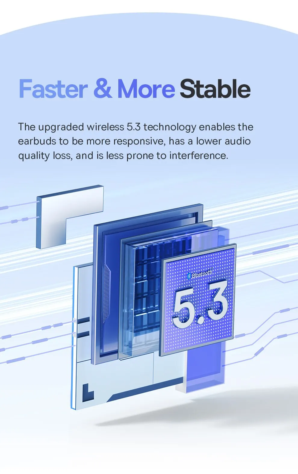 • Bluetooth 5,3:Наслаждайтесь бесперебойным подключением и более быстрой передачей данных с помощью новейшей технологии Bluetooth 5,3.