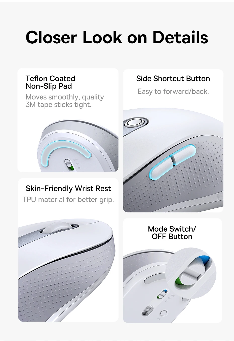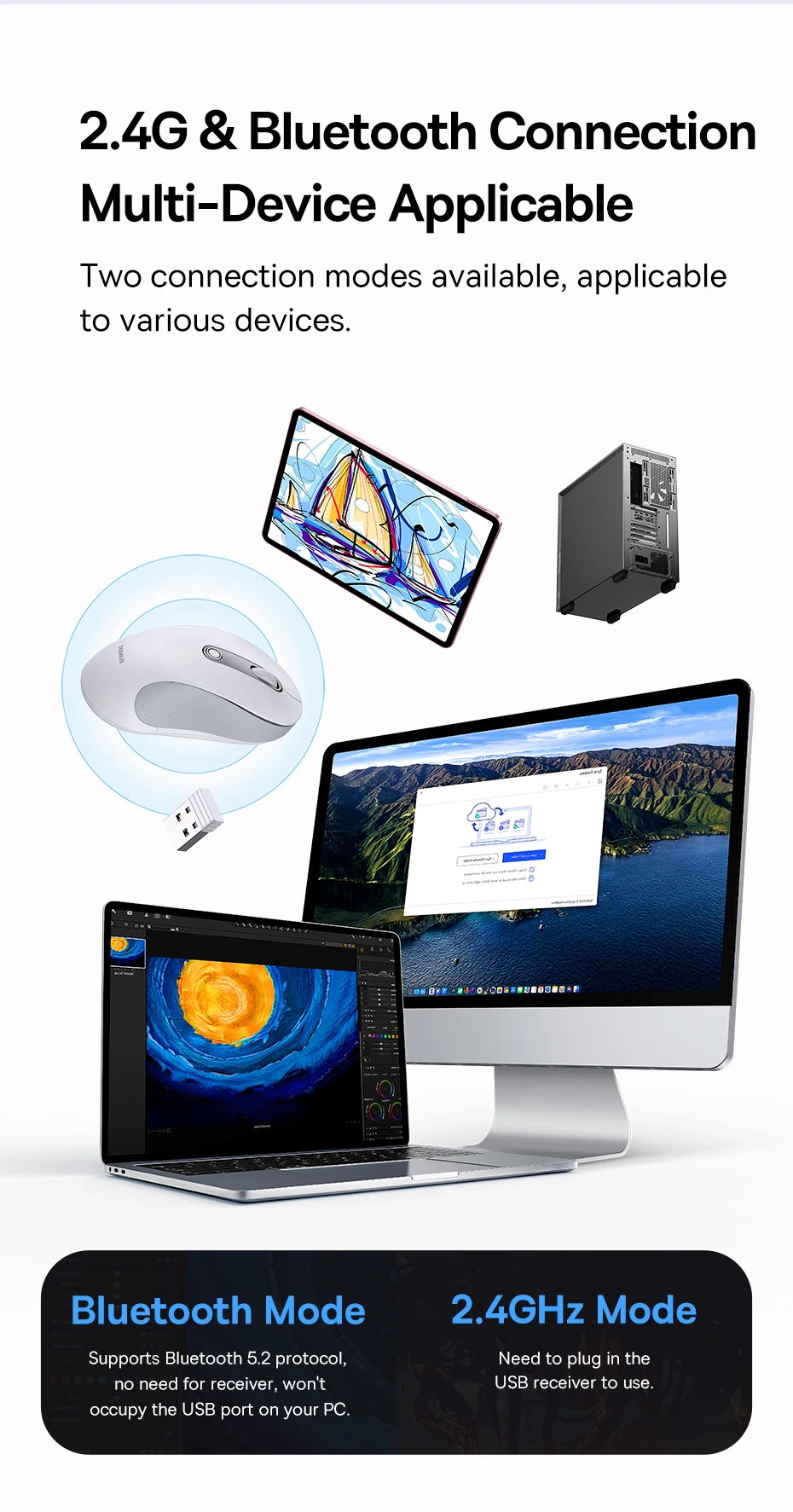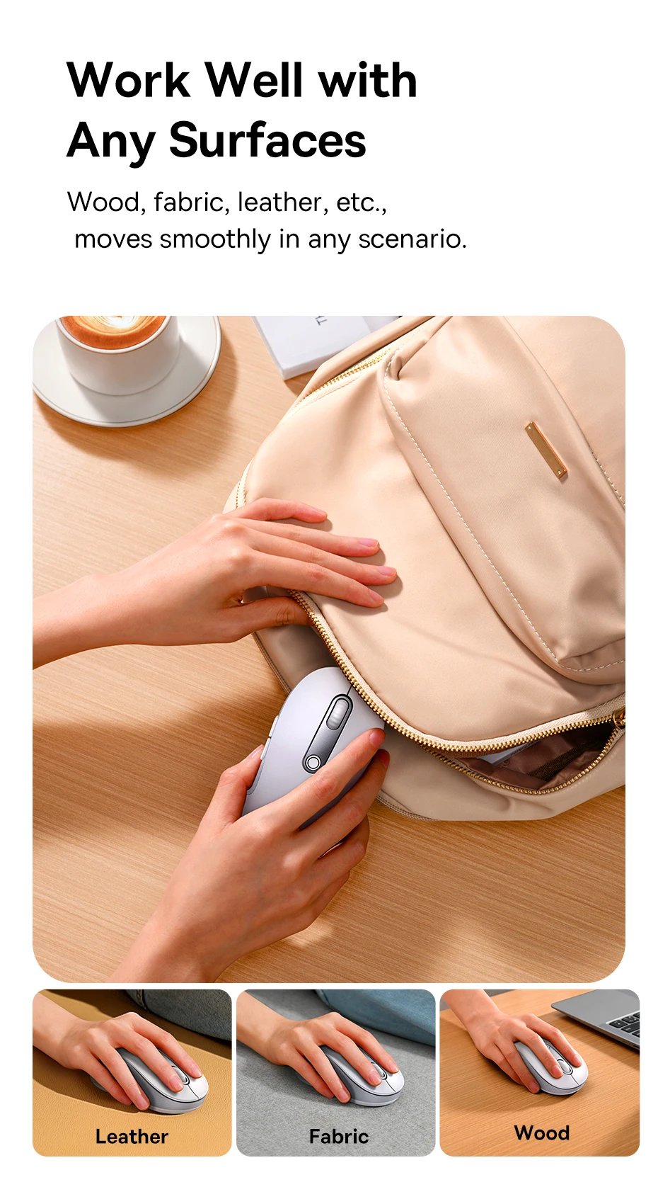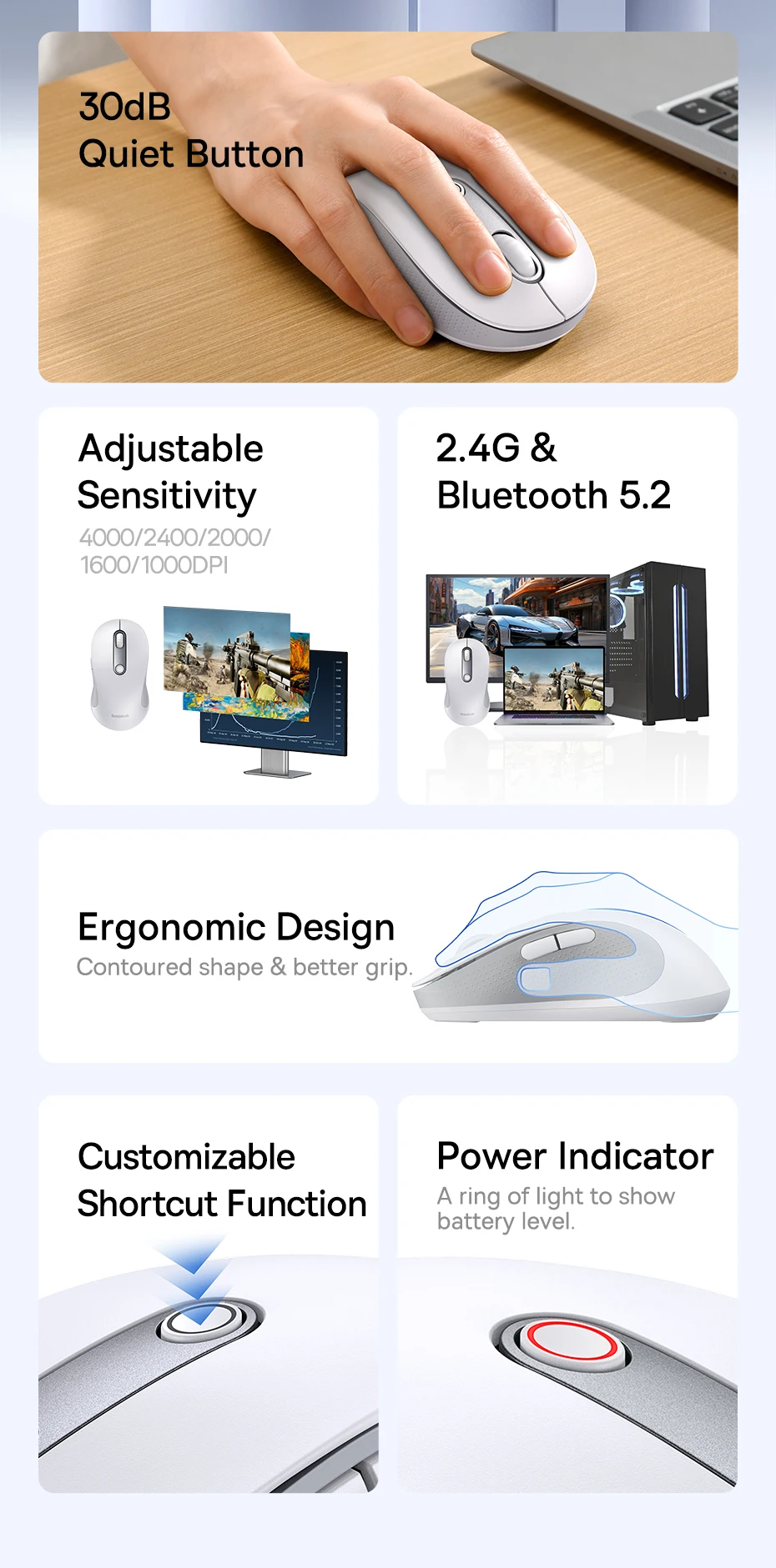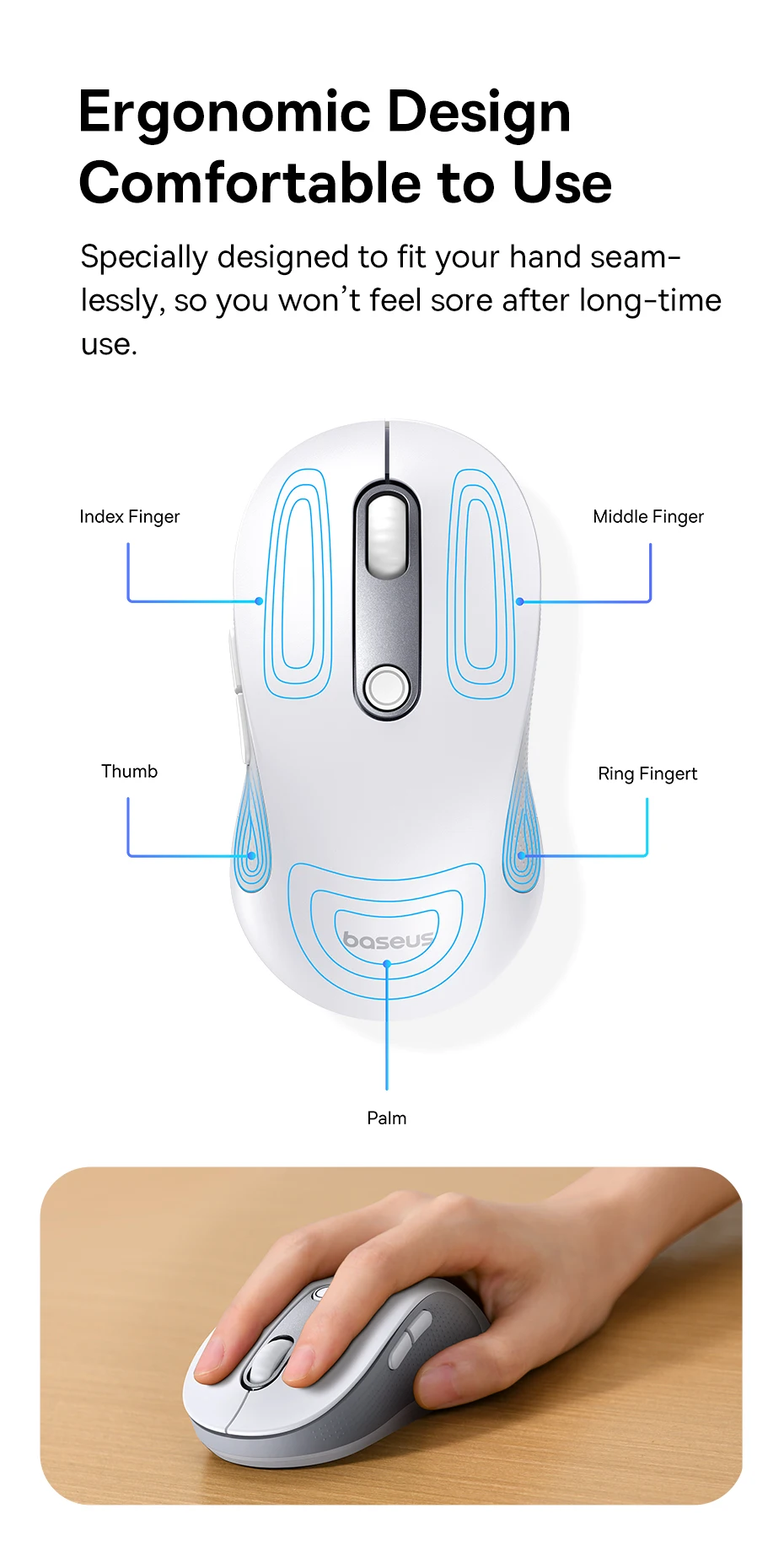 Эргономичная беспроводная мышь Baseus F02 обеспечивает комфорт и универсальность в использовании, что делает ее хорошим выбором как для работы, так и игр.