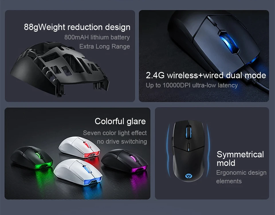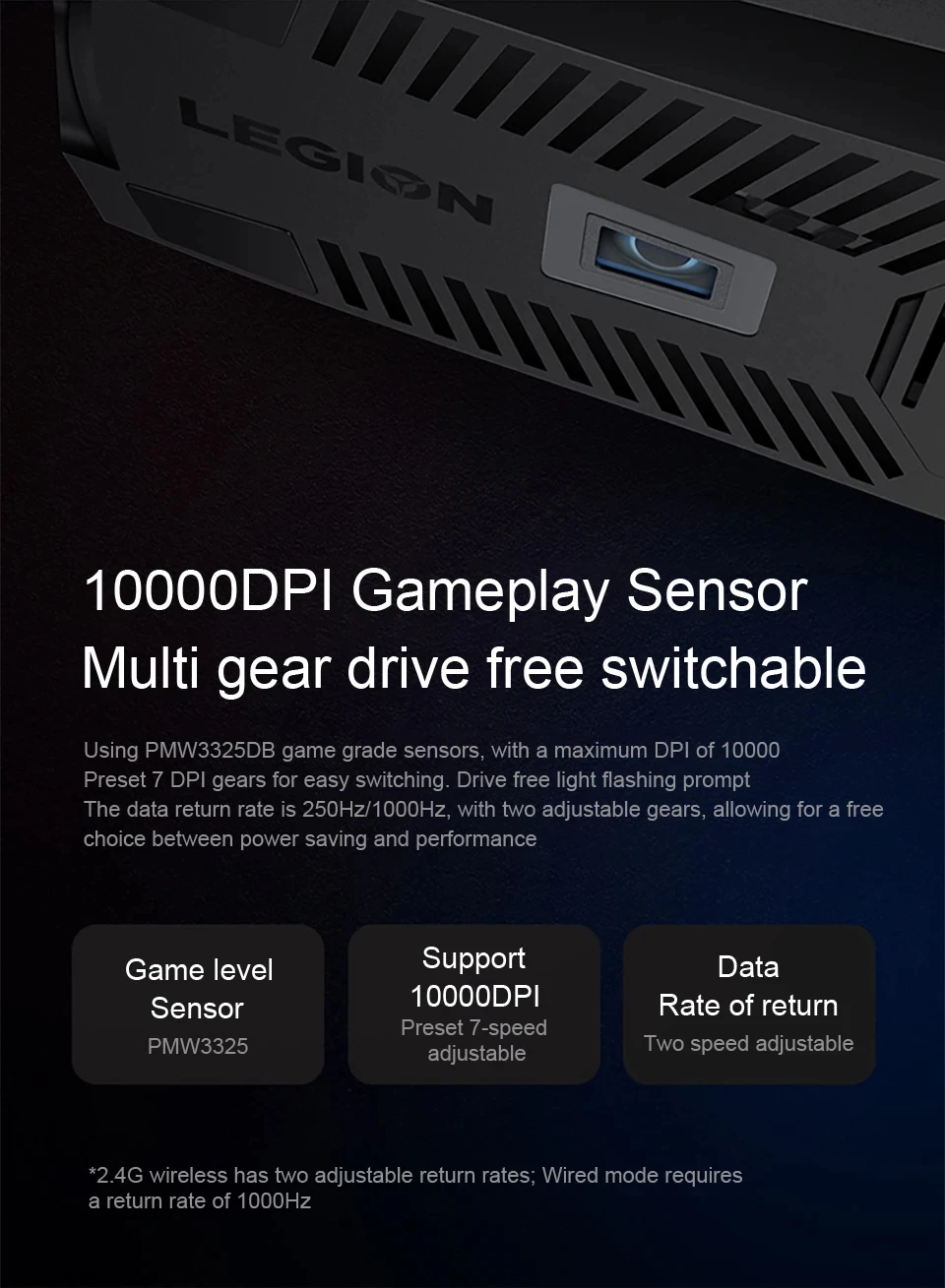 Сочетая в себе функциональность и стиль, LENOVO LEGION M500 предлагает широкий спектр возможностей. Стандартный интерфейс USB и 2.4ГГц беспроводная технология обеспечивают устойчивое и быстрое соединение с вашим компьютером. Вы можете настраивать DPI в диапазоне до 10000, чтобы точно отрегулировать скорость и чувствительность мыши под свое предпочтение.