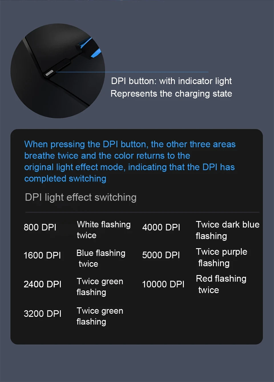 - Разрешение: 800/1600/2400/3200/4000/5000/10000 DPI - переключается кнопкой под колёсиком с световым RGB сопровождением (белый/синий/зелёный/голубой/тёмно-голубой/фиолетовый/красный - каждый из которых мигает дважды)
