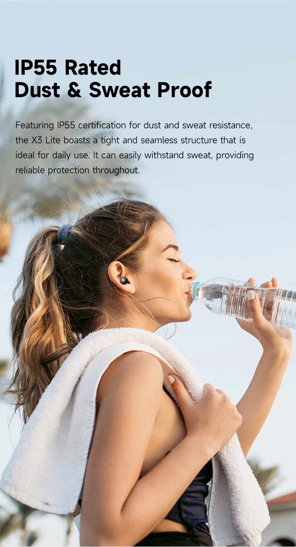 Пусть музыка сопровождает вас даже в экстремальных условиях! Наушники X3 Lite с водонепроницаемой конструкцией класса IP55 готовы к любым испытаниям. Не бойтесь капель дождя, пота или случайных брызг! Теперь вы можете слушать музыку даже во время интенсивной тренировки в спортзале или велосипедной прогулки в дождливый день.